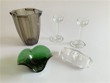 Lotto composto da un vaso, un posacenere e una coppia di candelieri, in vetro fumé, verde e incolore, e un modellino di automobile in cristallo parzialmente acidato (difetti)