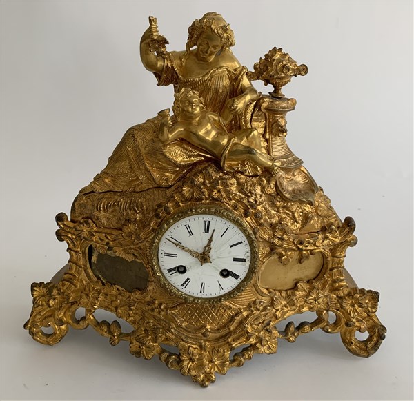 ANONIMO Pendola con cassa in metallo dorato a tema galante. Francia fine XIX S