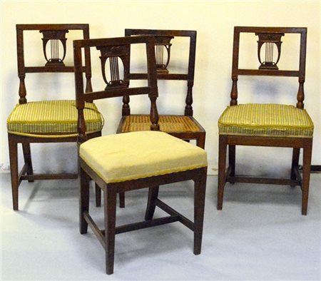 Gruppo di tre sedie con gambe rastremate e schienali a giorno unite ad una sedia di fattura simile. Secolo XVIII (difetti)