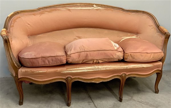 Divano in legno intagliato con schienale, braccioli e gambe di forma mossa (cm 155x111x65 circa) (difetti e restauri)