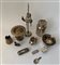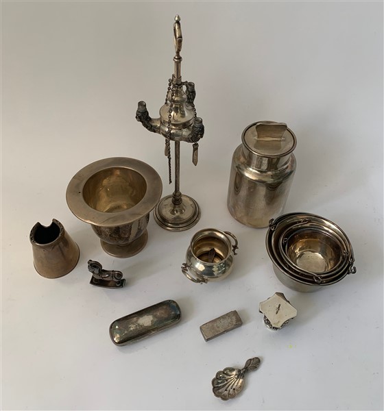 Lotto composto da quattro piccoli secchielli, un contenitore con coperchio, una lampada fiorentina, una zuccheriera e un vasetto, due portapillole e quattro bomboniere, in argento (gr 1850 ca) (difetti)