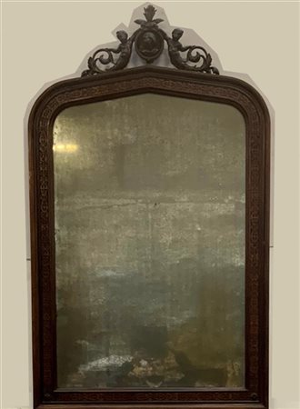 Specchio con cimasa scolpita a figure immaginarie e medaglione centrale con effige di donna (cm 157x95) (difetti)