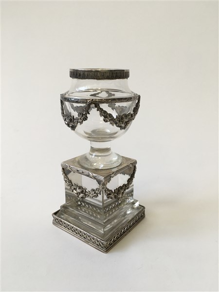 Vasetto in cristallo e argento su base a plinto (h. cm 15,5) (difetti)