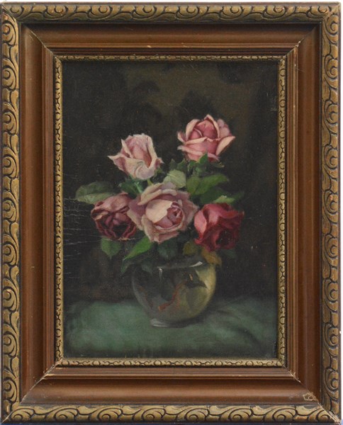 "Vaso con rose" olio su cartone pressato (cm 38x27,5) Firmato in basso a destra. In cornice