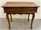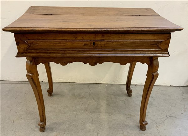 Scrittoio in legno con anta ribaltabile celante tre cassetti, fascia e gambe di
