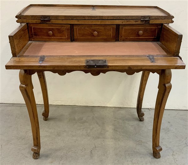 Scrittoio in legno con anta ribaltabile celante tre cassetti, fascia e gambe di forma mossa (cm 86x76x50) (difetti e restauri)