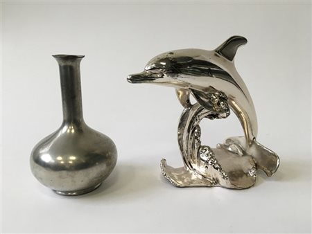 Lotto composto da una scultura a forma di delfino in metallo argentato su base in legno. Firmata e datata Christian Venica 1992 e un vasetto in peltro (difetti)