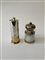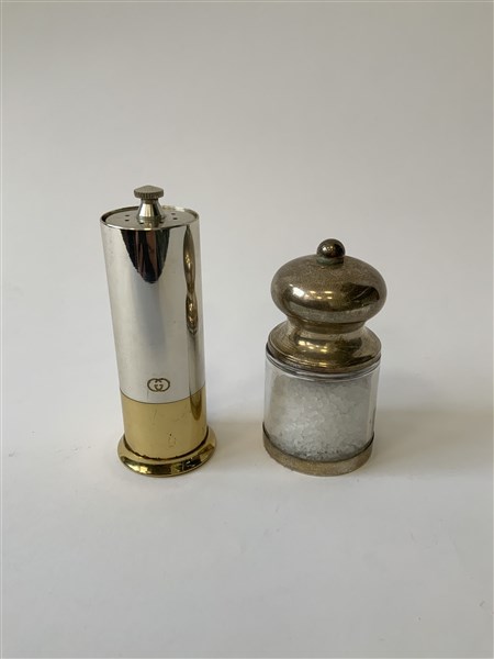 Lotto composto da una saliera montata in argento titolo 800 unita ad una pepiera in metallo argentato e marcata Gucci (lievi difetti)