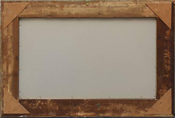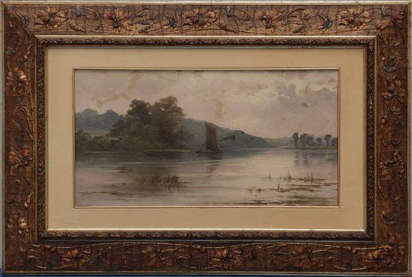 Firma indecifrata "Paesaggio fluviale" olio su cartone pressato (cm 30x57) Firmato in basso a sinistra. In cornice