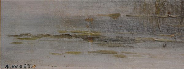 Firma indecifrata "Paesaggio fluviale" olio su cartone pressato (cm 30x57) Firm