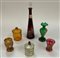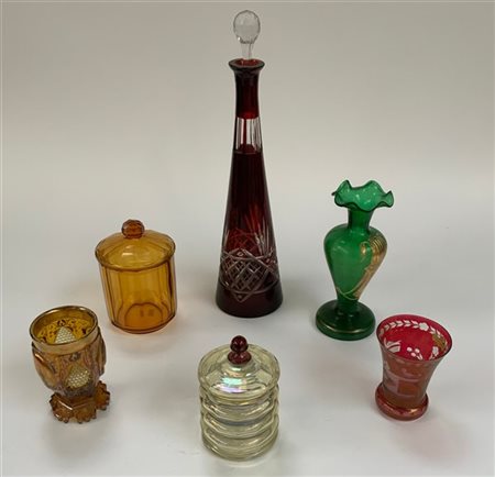 Lotto composto da una bottiglia e due bicchieri in vetro manifattura di Boemia, due zuccheriere con coperchio in vetro e un vaso in vetro verde con decorazione Liberty (difetti)