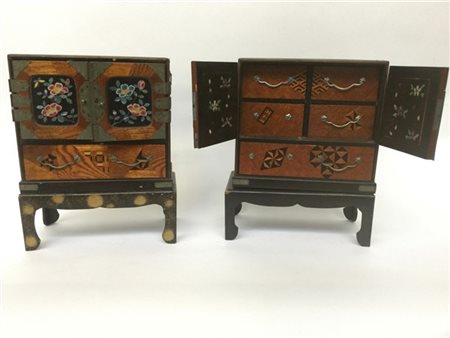 Manifattura giapponese inizio secolo XX, coppia di piccoli stipi in legno intarsiato a parqueterie, parzialmente laccati, ante recanti tiretti, su basi con piedini sagomati (difetti)