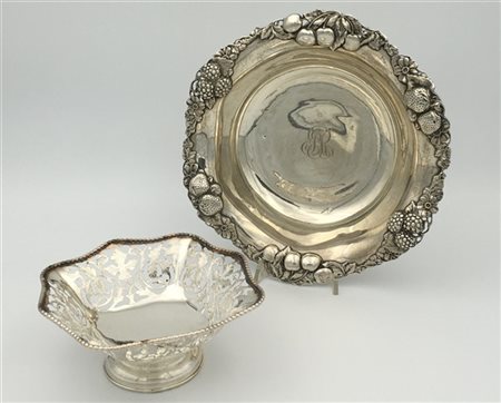 Ciotola in argento liscio e cesellata a frutta e fiori lungo il bordo, punzoni inglesi, unita ad alzata traforata a volute e motivi fogliacei (g 590) (lievi difetti)