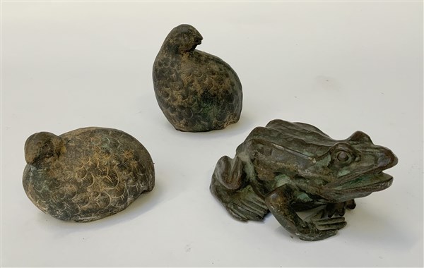 Lotto composto da una scultura in bronzo raffigurante un ranocchio e due quagli