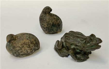 Lotto composto da una scultura in bronzo raffigurante un ranocchio e due quaglie in terracotta patinata (h max cm 10,5) (difetti)