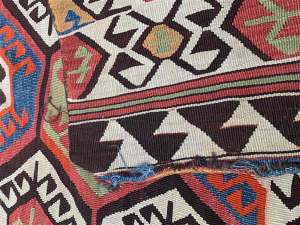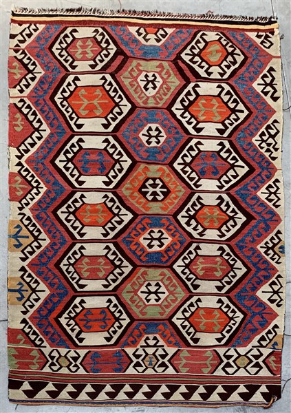 Tappeto KIlim, Anatolia, Secolo XX. Decoro Memling Gül (Difetti) (cm 189x131)
