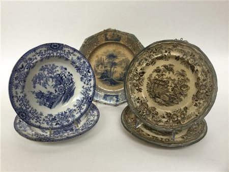 Manifattura inglese. Lotto di quindici piatti decorati in monocromia raffiguran