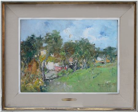 "Paesaggio" olio su compensato (cm 30x40) Firmato e locato Napoli in basso a destra. In cornice (difetti)