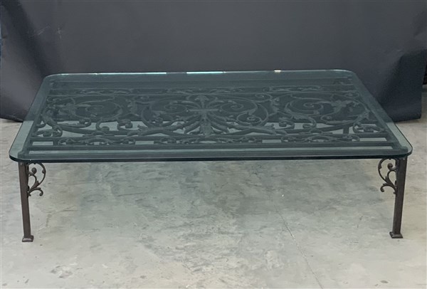 Tavolo da salotto ricavato da una ringhiera in ferro battuto con decoro a foglie e volute, piano in cristallo (cm 182x45x135) (difetti)