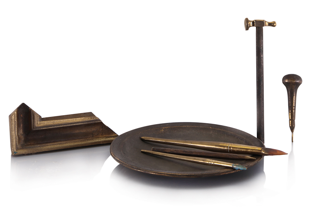 ALIK CAVALIERE Roma 1926 - Milano 05/05/1998 Senza titolo, 1979 multiplo in bronzo (piatto + 6 oggetti) diametro piatto cm. 24,5; esemplare VII/X, opera non firmata, tiratura realizzata dall'Istituto Finanziario per l'Arte Finarte S.p.A. in occasione del ventesimo anno di attività della Società, entro custodia originale.
