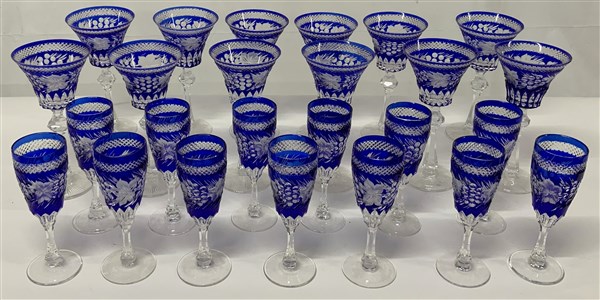 Manifattura di Boemia. Parte di servizio di bicchieri a calice decorati su fondo blu (difetti)