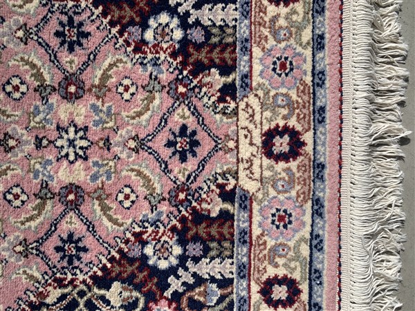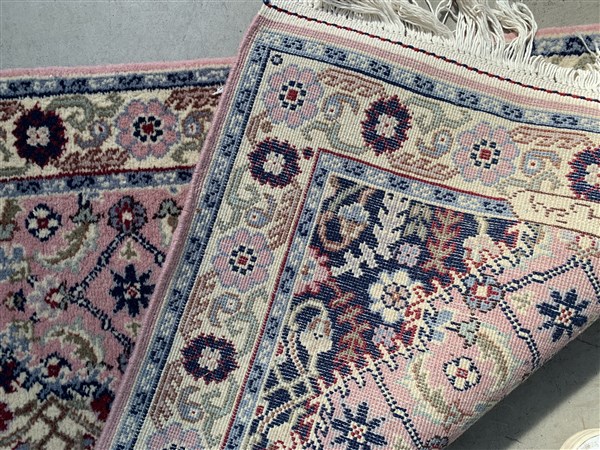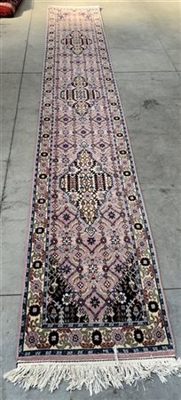 Tappeto passatoia, Romania, Secolo XX. Decoro con medaglioni su fondo rosa (Lievi difetti) (cm 410x76)