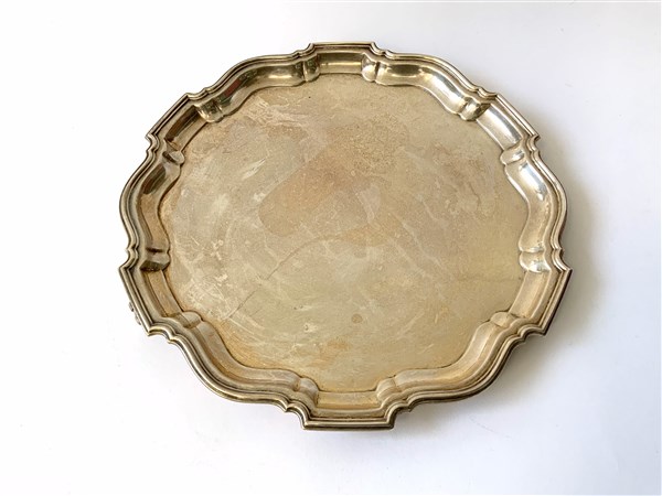 Alzata di forma sagomata in argento liscio e tesa scanalata a gole. Punzoni di Birmingham, 1934. Argentieri Barker Bros Ltd (cm 26x1,7x26) (g 520)