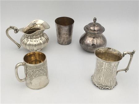Lotto composto da tre boccali, una lattiera ed una zuccheriera in argento di epoche diverse (g 800)