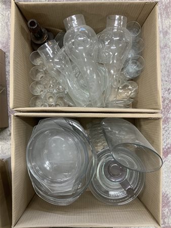 Due cartoni contenenti numerose pirofile, bicchieri ed altri oggetti in vetro per la tavola (difetti)