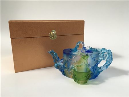 Teiera in vetro parzialmente molato. In custodia.