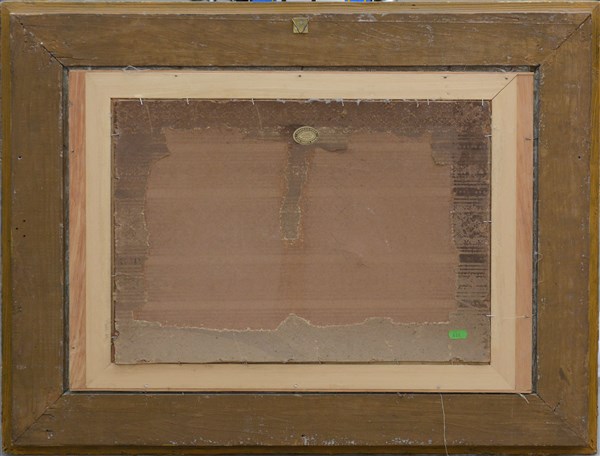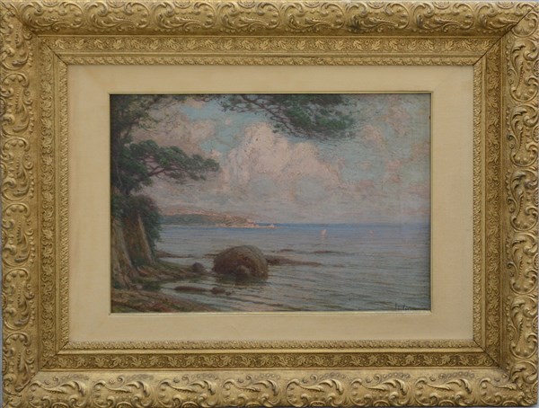 Firma indecifrata "Veduta costiera" olio su cartone (cm 35x51) Firmato in basso a destra, in cornice