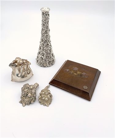 Lotto composto da tre oggetti decorativi sbalzati a forma di mazzi fioriti e cesto di primizie rivestiti in argento (g lordi 300) uniti ad un vasetto decorato a fiori e marcata "Stilarte" (difetti)