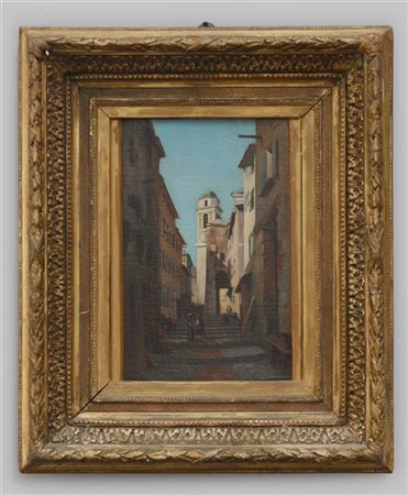"Veduta di paese con figure" olio su tela (cm 33x23) Firmato in basso a destra. In cornice