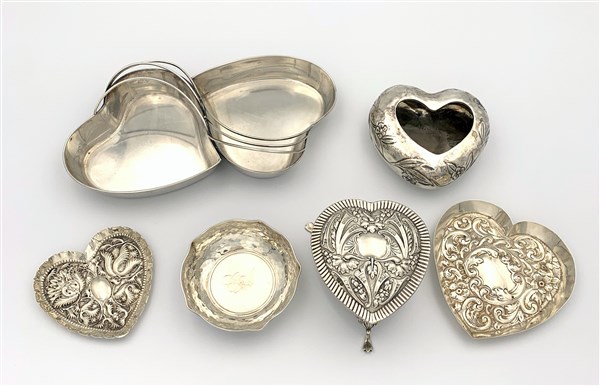 Lotto composto da sei oggetti diversi di cui cinque a forma di cuore in argento