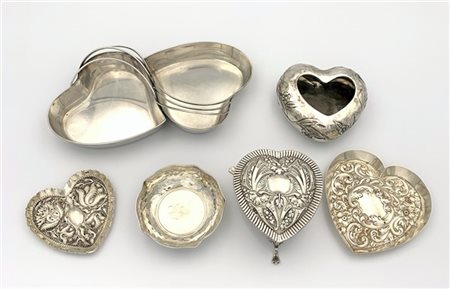 Lotto composto da sei oggetti diversi di cui cinque a forma di cuore in argento liscio e sbalzato, di epoche diverse (g 550)