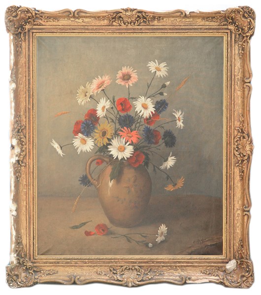 Firma indecifrata "Natura morta con vaso di fiori" olio su tela (cm 95x80) Firmato in basso a destra. In cornice (difetti alla cornice)