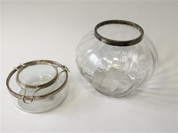 Lotto composto da un vaso in vetro di forma bombata con ghiera in argento, unito ad un porta caviale in vetro con bordura in metallo argentato (difetti)