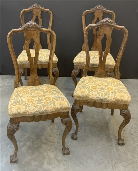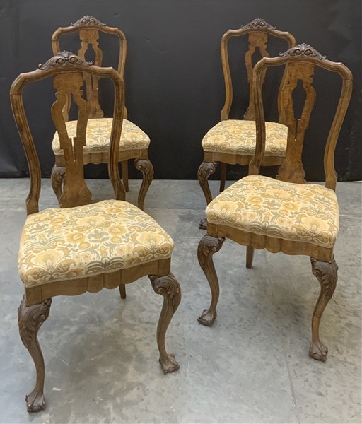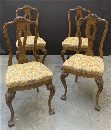Gruppo di otto sedie con cimasa intagliata a volute e gambe mosse (gravi difetti)