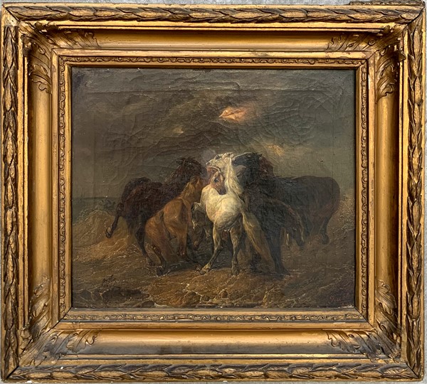 Ludwig Kübler "Cavalli nella tempesta" 1847, olio su tela (cm 29x34.5) Firmato e