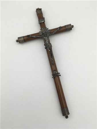 Arte del secolo XIX. Cristo crocifisso, scultura in argento con croce in legno tornito con puntali in argento (h cm 35) (difetti)