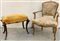 Lotto composto da una poltroncina e un panchetto di forma mossa in legno intagliato (difetti)