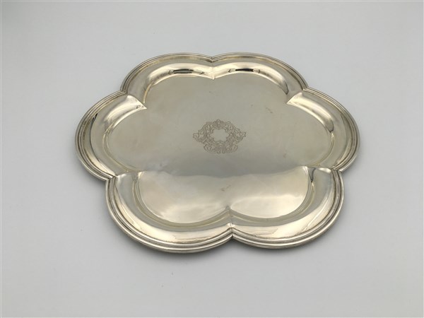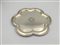 Piatto in argento a forma di fiore, cavetto inciso a motivi vegetali, titolo 92