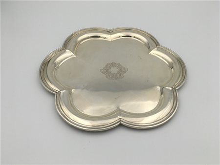 Piatto in argento a forma di fiore, cavetto inciso a motivi vegetali, titolo 925 (gr 640)