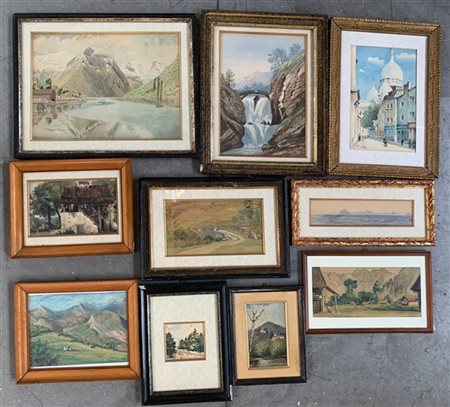 Gruppo di dieci dipinti raffiguranti "Paesaggi"e "Scorci con edifici" autori, misure e tecniche differenti, in cornici