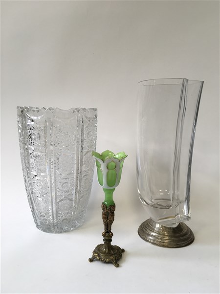 Lotto composto da un vaso in vetro a forma di cuore con base in argento, una tulipaniera in vetro e metallo ed un vaso in cristallo (difetti)