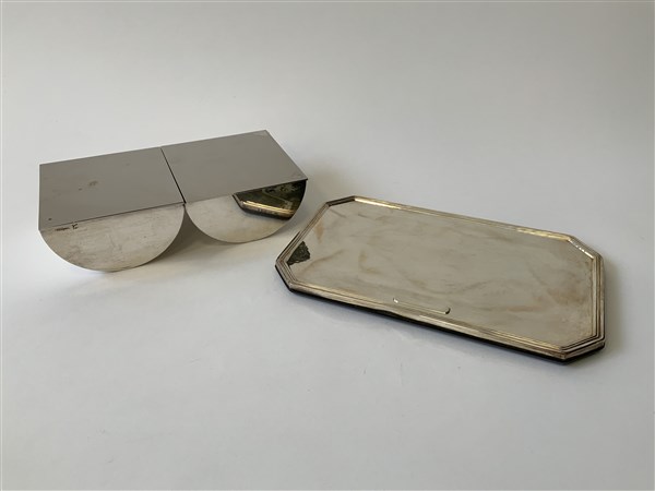Lotto composto da una scatola di forma sagomata a doppio corpo in metallo argentato marcata sul fronte, unita ad uno svuotatasche di forma ottagonale ricoperto in argento, titolo 925
