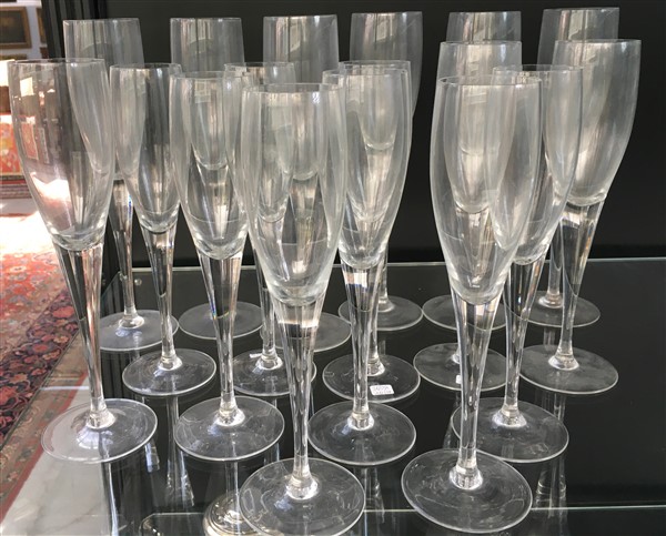 Lotto composto da diciotto flute in vetro trasparente incolore. Italia, secolo XX. (h max cm 26,5) (lievi difetti)