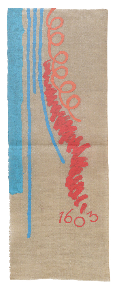 GIORGIO GRIFFA Torino 29/03/1936 Tre linee con arabesco n. 1603, 2001 acrilici su tela cm. 122x43, firma e anno al retro, dichiarazione d'autenticità dell'artista e Archivio Griffa numero 01-010 su foto, pubblicato su "Giorgio Griffa, Segnando pittura", a cura di Alberto Fiz, Silvana Editoriale, 2008, pagina 165 e sul catalogo della mostra tenutasi presso la Galleria Giraldi (LI), pagina 38.