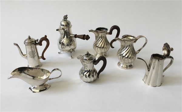 Lotto composto da sei teiere e una salsiera, modelli in miniatura in argento (g