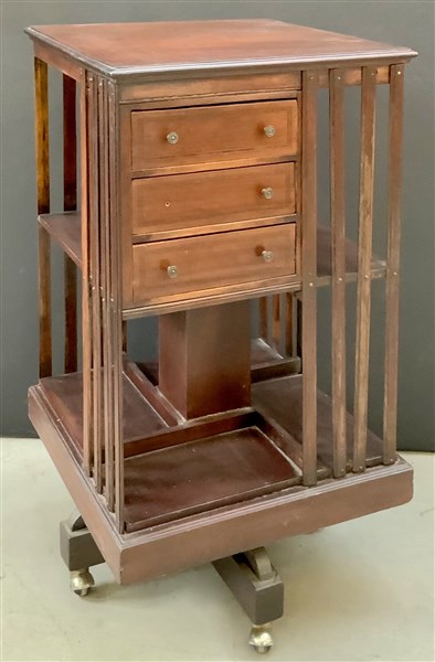 Libreria girevole con vani a giorno, listelli verticali e piede munito di rotel